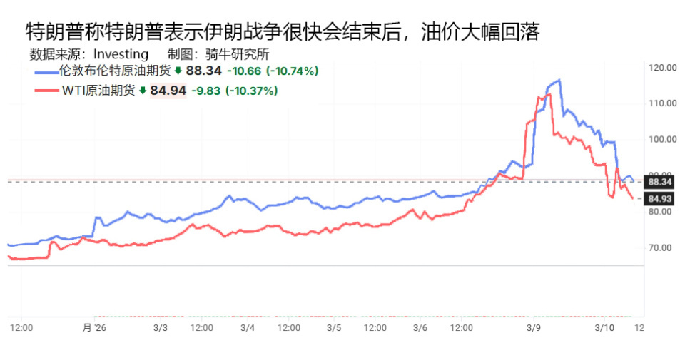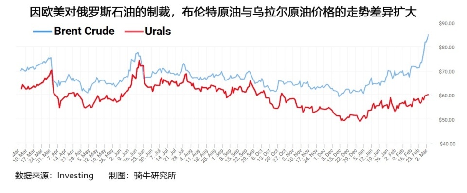 但这一坚挺的油价持续不过两天。周一下午特朗普宣布伊朗战争可能很快结束之后,布伦特原油价格很快跌至88美元左右。如果伊朗战争真如特朗普所言很快结束,国际油价可能在战争结束一周内重新跌回70美元以下,乌拉尔原油混合油价也将跌回45美元左右。