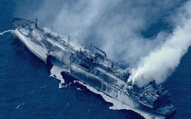 上图为乌克兰无人舰艇击中的一艘俄罗斯LNG运输船。