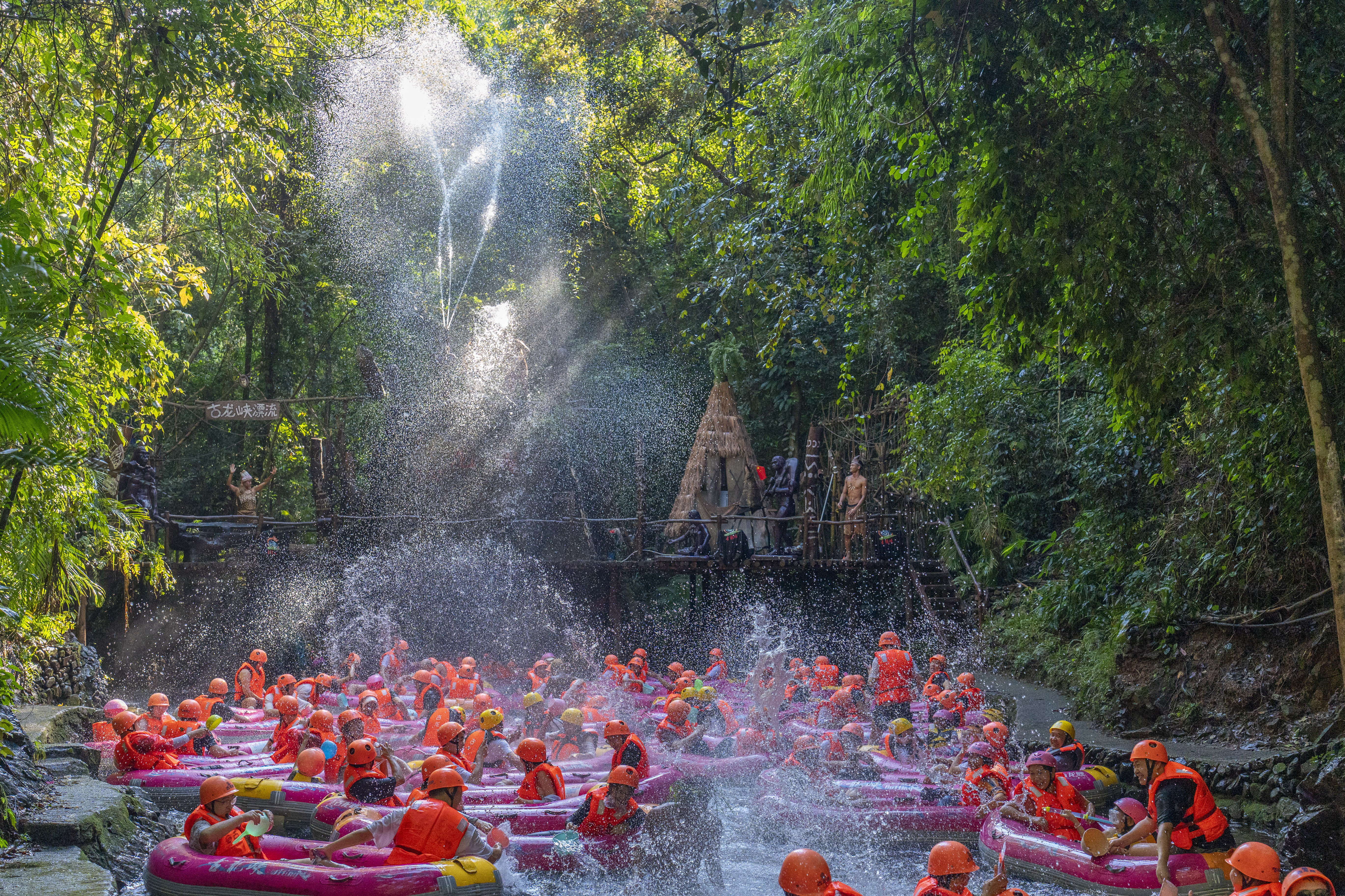 漂流项目作为清新文旅“金字招牌”,持续升级玩法。以古龙峡、玄真峡谷、笔架山、清泉湾等景区在保留核心体验的基础上,积极创新场景与活动:古龙峡景区推出“狂野亚马逊野人部落表演”,让游客沉浸式感受异域文化;引入非遗吹糖人项目,增添传统趣味;新增“飞跃彩虹”高空体验项目,进一步丰富高空游乐业态。据统计,国庆中秋假期古龙峡景区接待人数达17.8万人次,较去年同期增长19.7%。笔架山旅游区则围绕“山水”主题,举办户外观瀑旅游季暨Mountain Walk徒步活动,并新增瀑布飞人特技秀,让游客在欣赏自然景观的同时,感受惊险刺激的表演,提升游玩体验感。